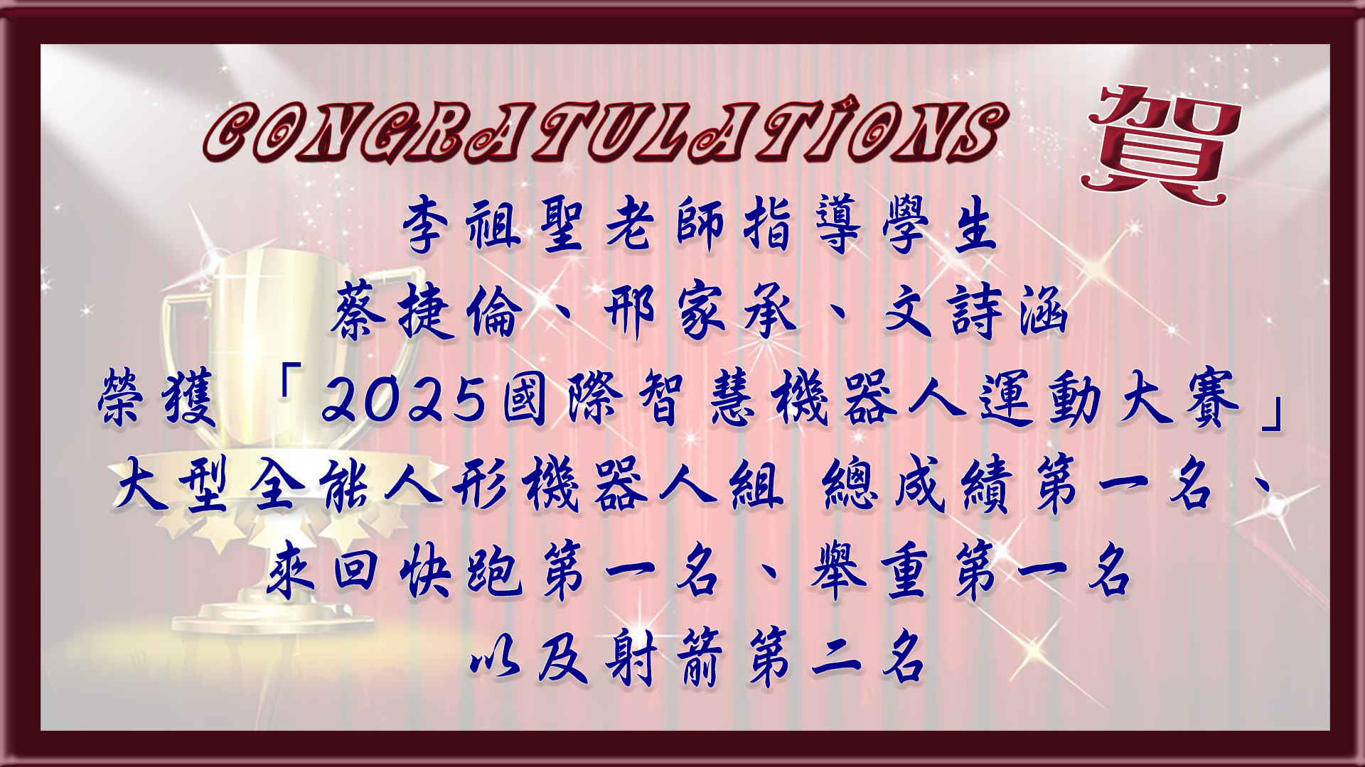 賀 李祖聖老師指導碩士生蔡捷倫、邢家承、文詩涵榮獲「國際智慧機器人運動大賽2025」大型全能人形機器人組:總成績第一名、來回快跑第一名、舉重第一名以及射箭第二名
