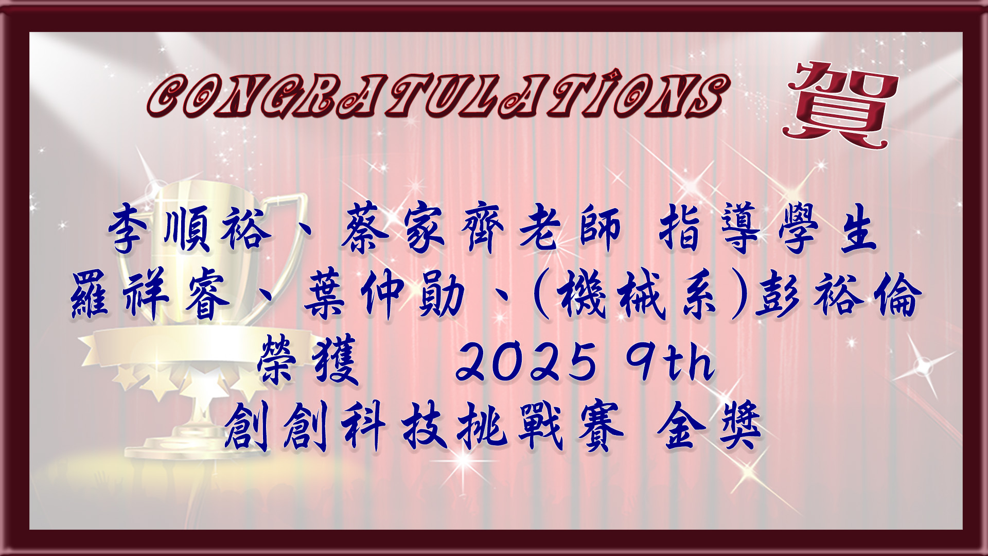 賀 李順裕、蔡家齊老師指導本系與機械系同學榮獲2025 9th 創創科技挑戰賽 金獎