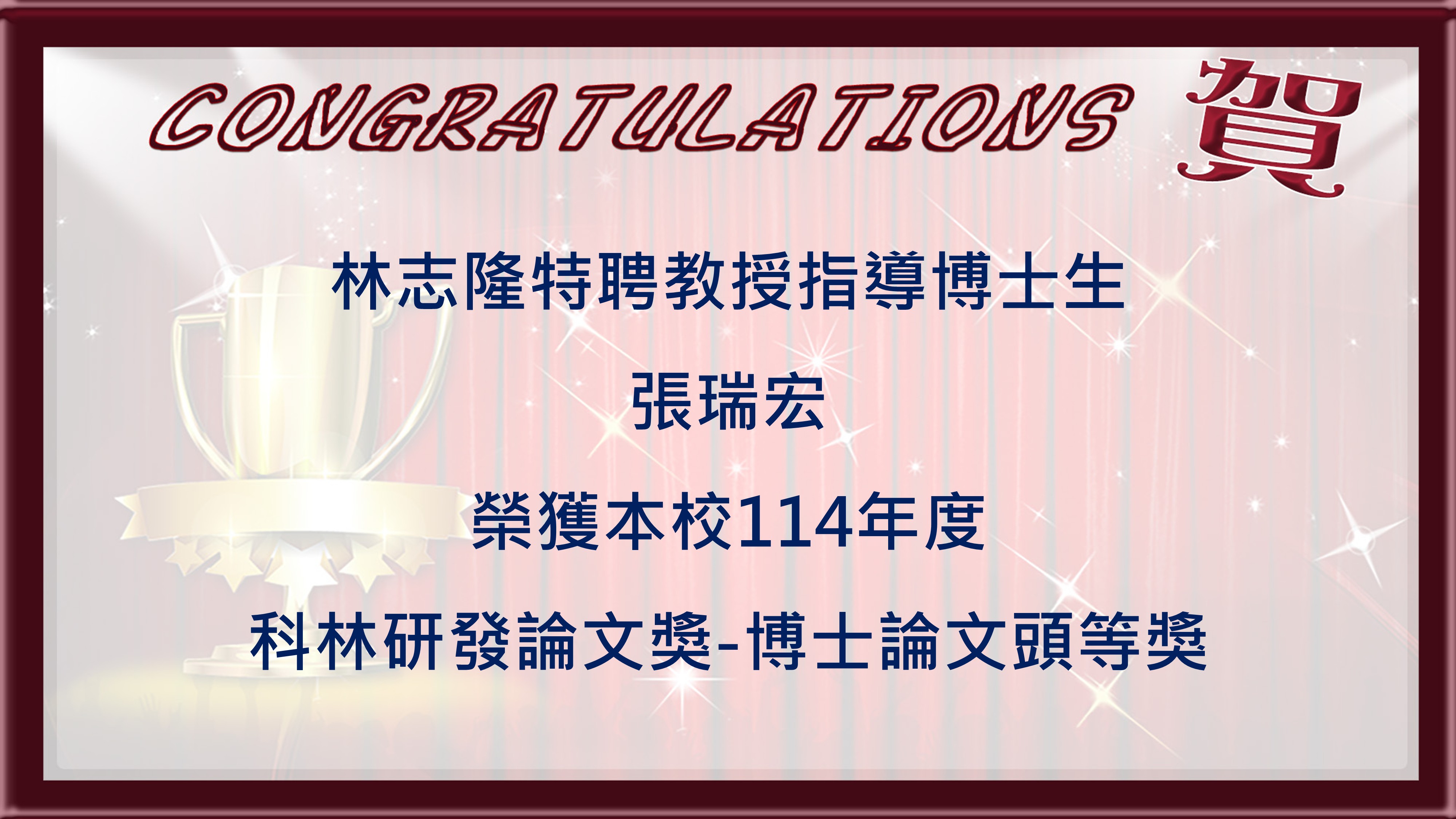賀 林志隆特聘教授指導博士生張瑞宏榮獲本校114年度科林研發論文獎-博士論文頭等獎