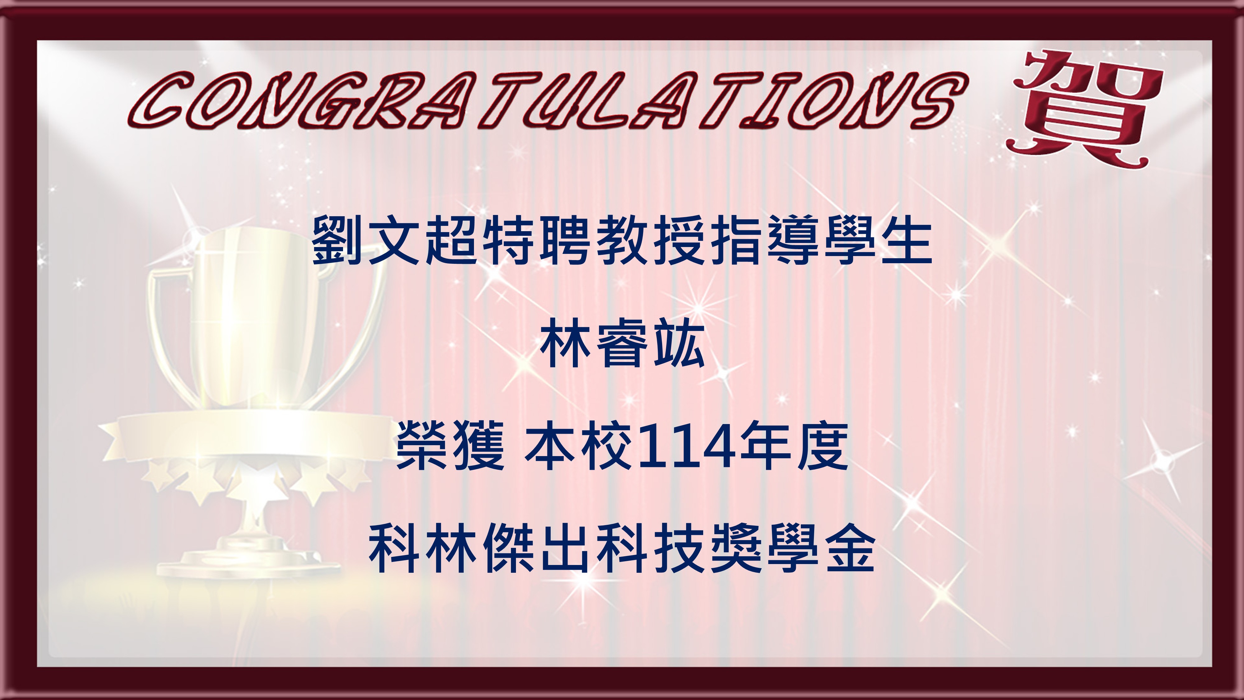 賀 劉文超特聘教授指導學生林睿竑榮獲本校114年度科林傑出科技獎學金