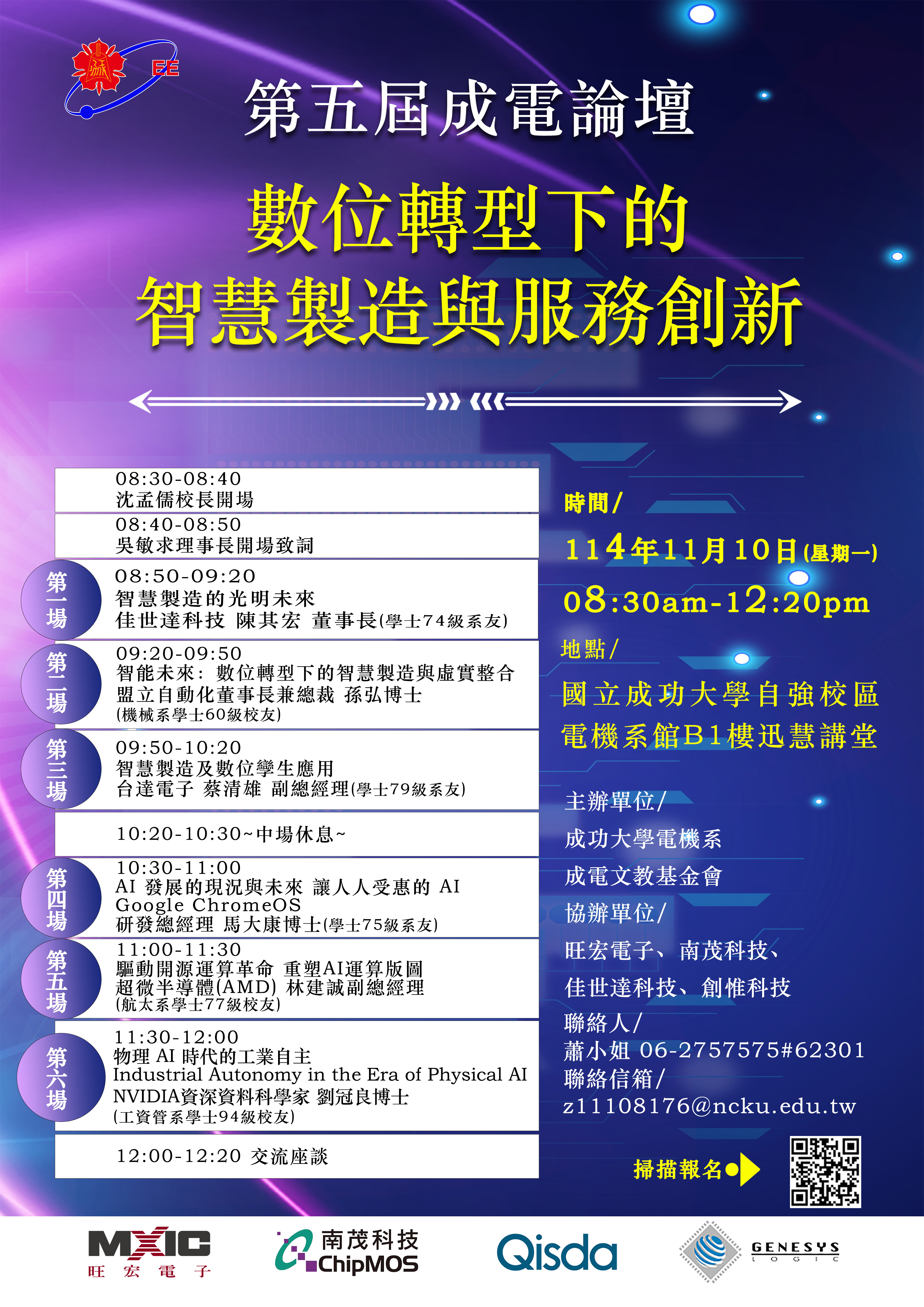 內容 | 第五屆成電論壇將於114/11/10(一)上午8點30分假電機系館B1F迅慧講堂舉行,主題:「數位轉型下的智慧製造與服務創新」,敬邀各位共襄盛舉。 以下為議程與報名連結,為維持聽講品質敬請於10/22前報名,謝謝。 https://forms.gle/2XD4ERgYJpLLCXkHA |