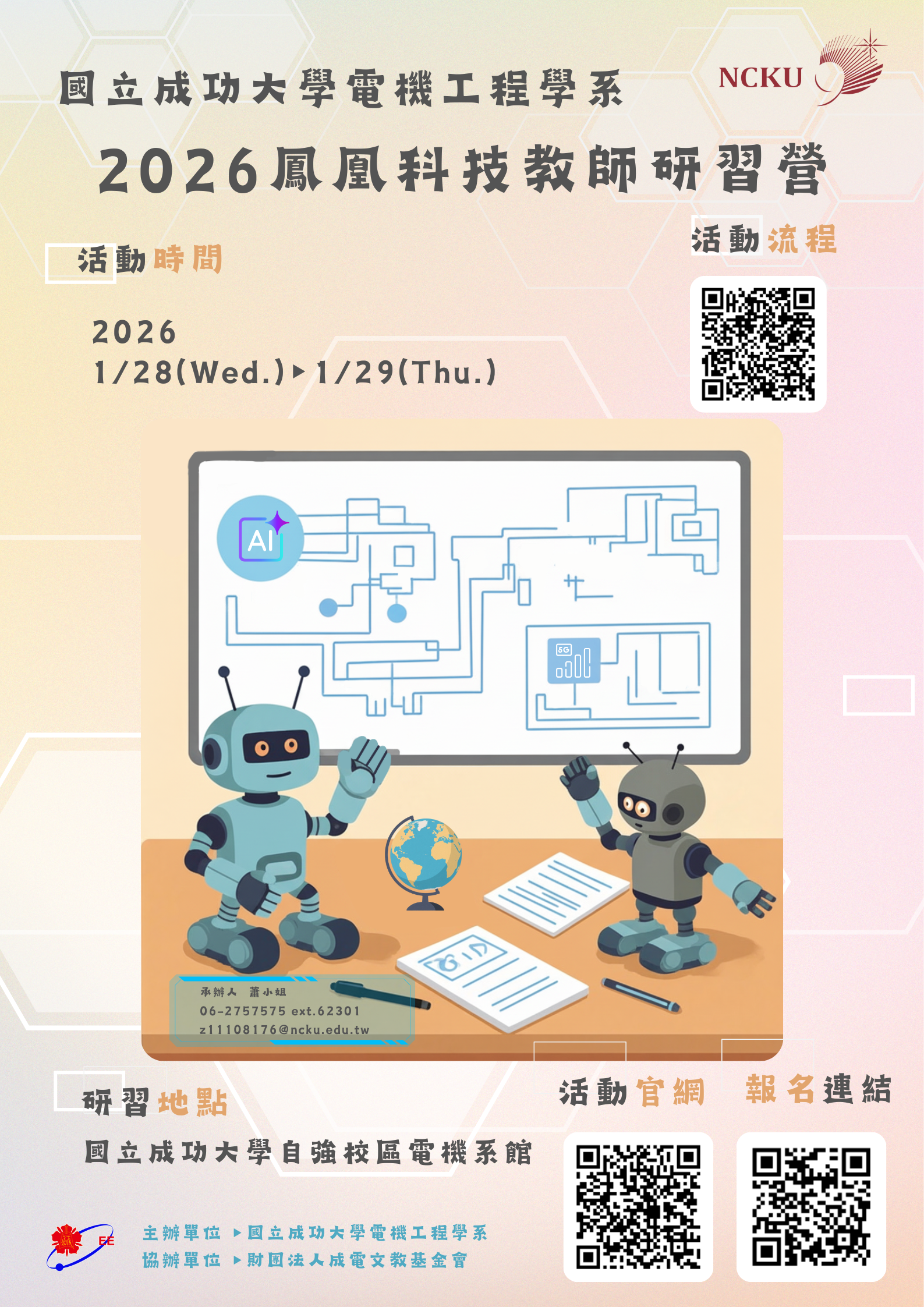 | 公告 | 本系辦理「2026成大鳳凰科技教師營」,敬邀各校教師踴躍報名參加 |